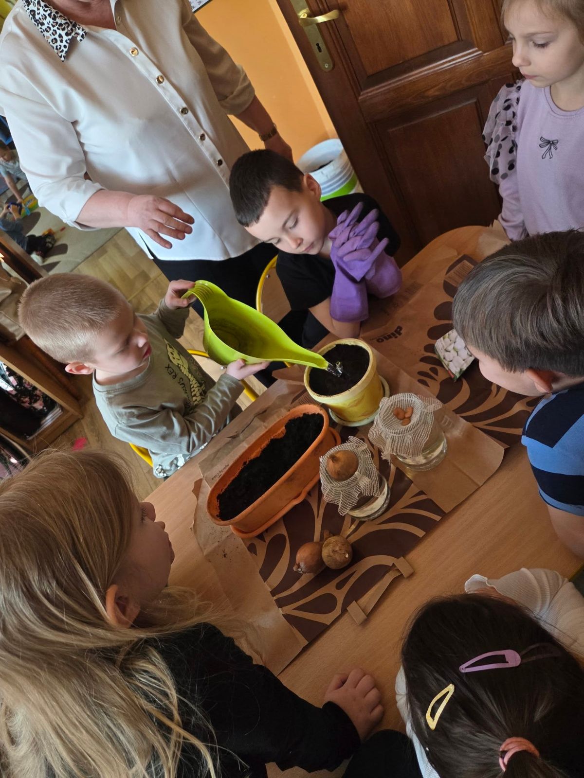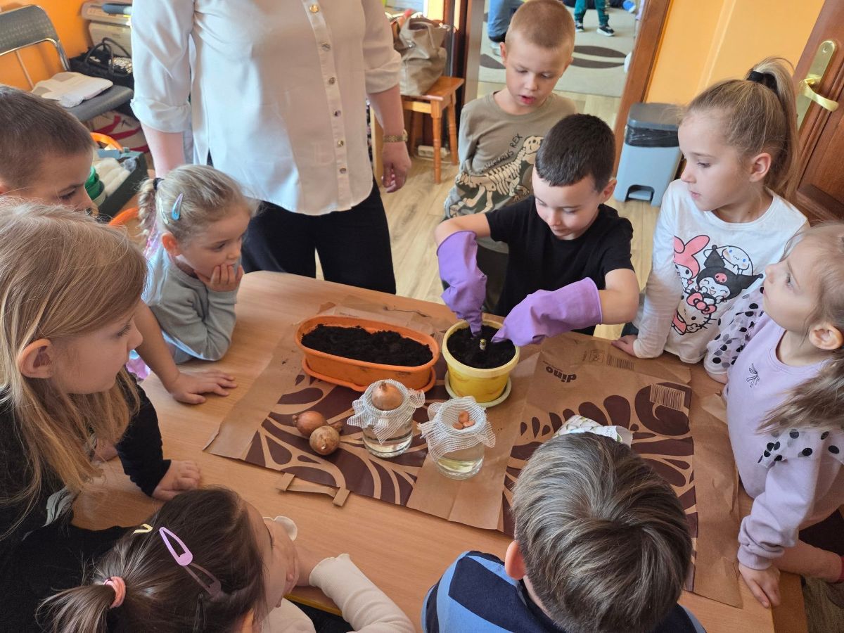 Przedszkolaki z Borzęcina Dolnego rozpoczęły wiosenne przebudzenie w kąciku przyrody. Zainspirowane opowiadaniem Doroty Niewoli ,,Skrawek wiosny w kąciku przyrody” - sadziły kwiaty cebulowe, dymkę na szczypiorek, fasolę i siały słonecznik oraz rzeżuchę.
