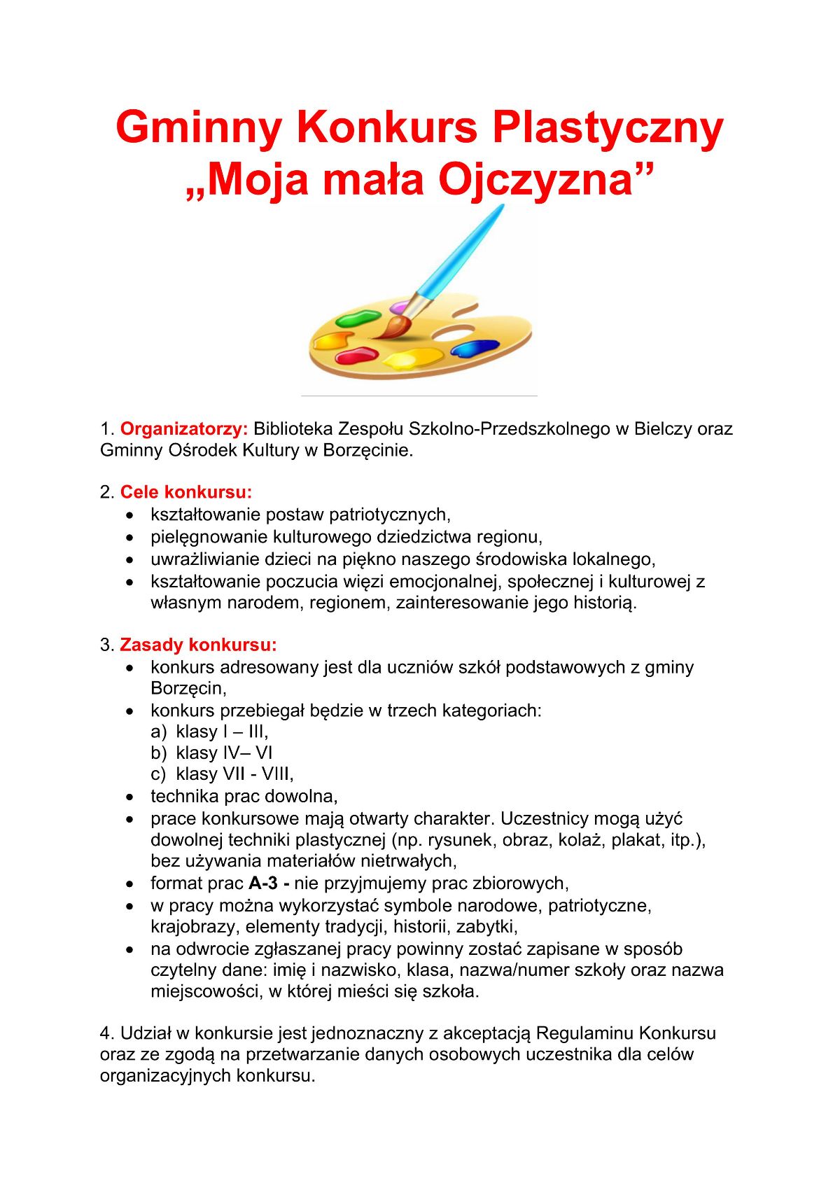 Biblioteka Zespołu Szkolno-Przedszkolnego w Bielczy oraz Gminny Ośrodek Kultury w Borzęcinie zapraszają uczniów szkół podstawowych z terenu gminy Borzęcin do udziału w Gminnym Konkursie Plastycznym „Moja mała Ojczyzna”.