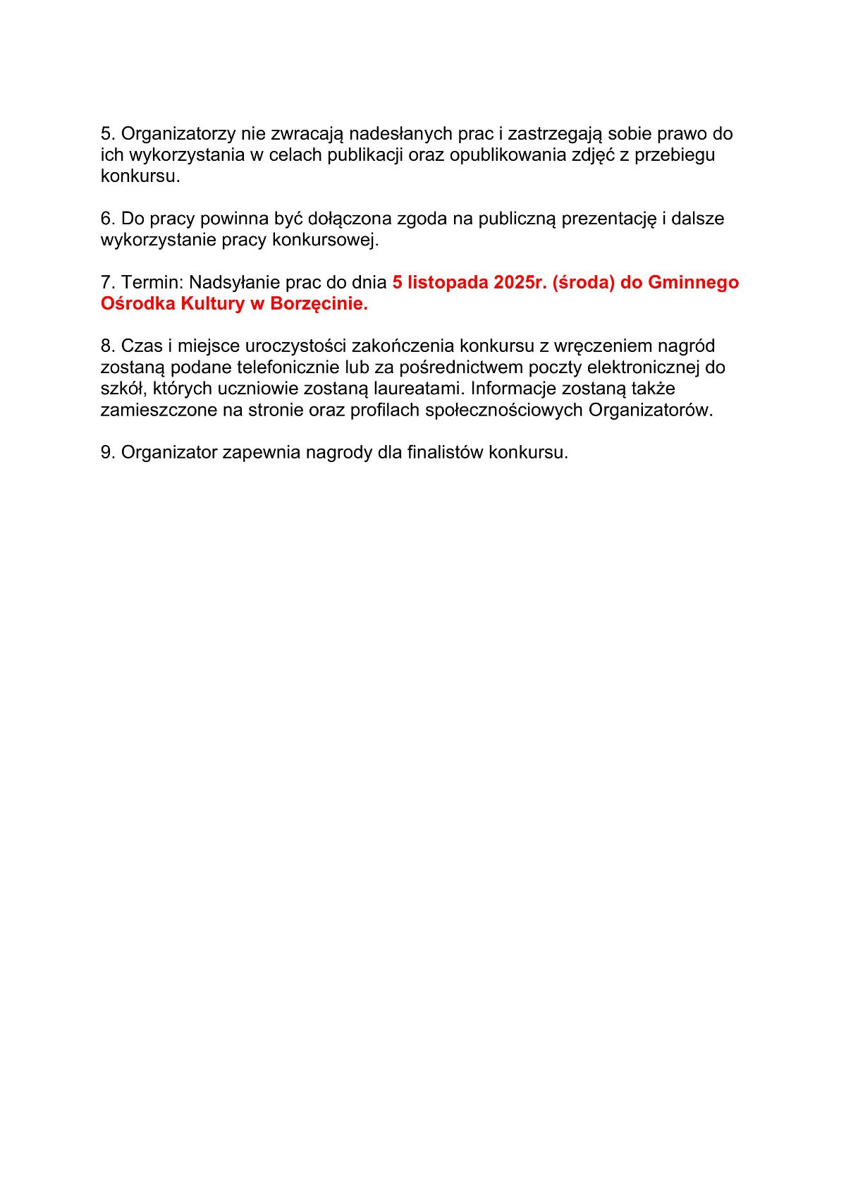 Prace należy dostarczyć do Gminnego Ośrodka Kultury w Borzęcinie do dnia 5 listopada 2025r. (środa).
