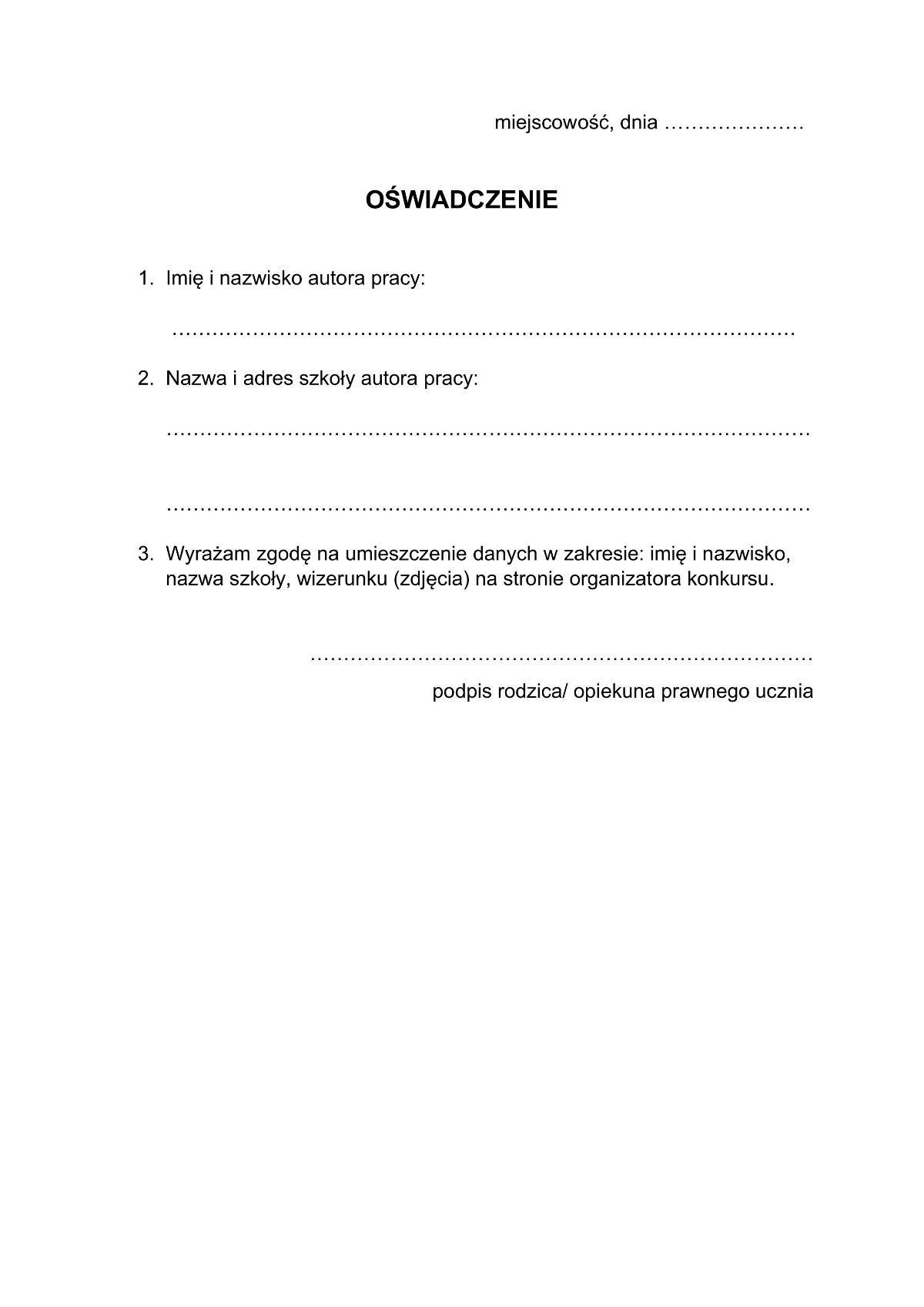 Każda praca powinna zawierać na odwrocie czytelne dane: imię i nazwisko, klasę, nazwę szkoły oraz miejscowość.