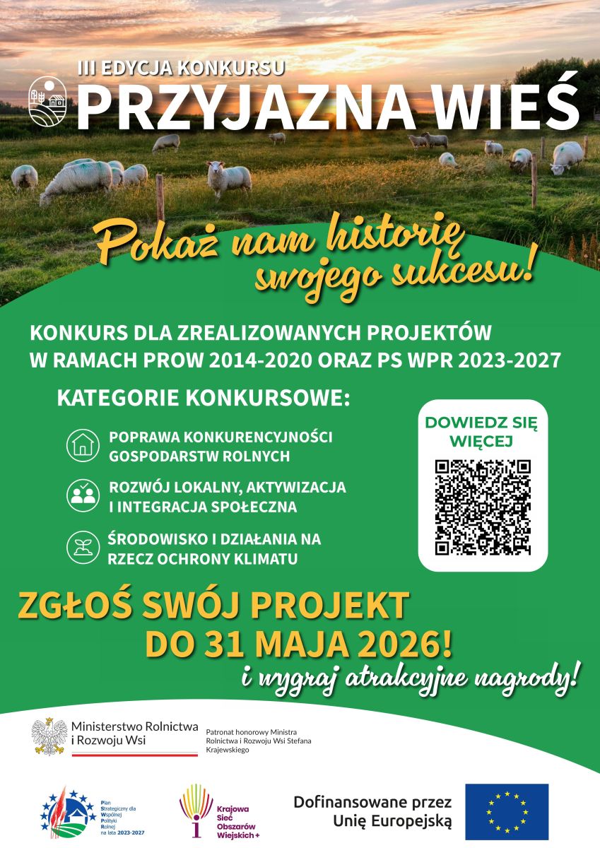 UWAGA! W konkursie nie zostaną przyjęte do oceny projekty, które zostały ocenione w pierwszej oraz drugiej edycji konkursu „Przyjazna Wieś” w latach 2023 oraz 2025, laureaci ogólnopolskiego konkursu „Sposób na sukces” (wszystkie edycje) oraz projekty, które znajdują się w Bazie dobrych praktyk — otwórz bazę.