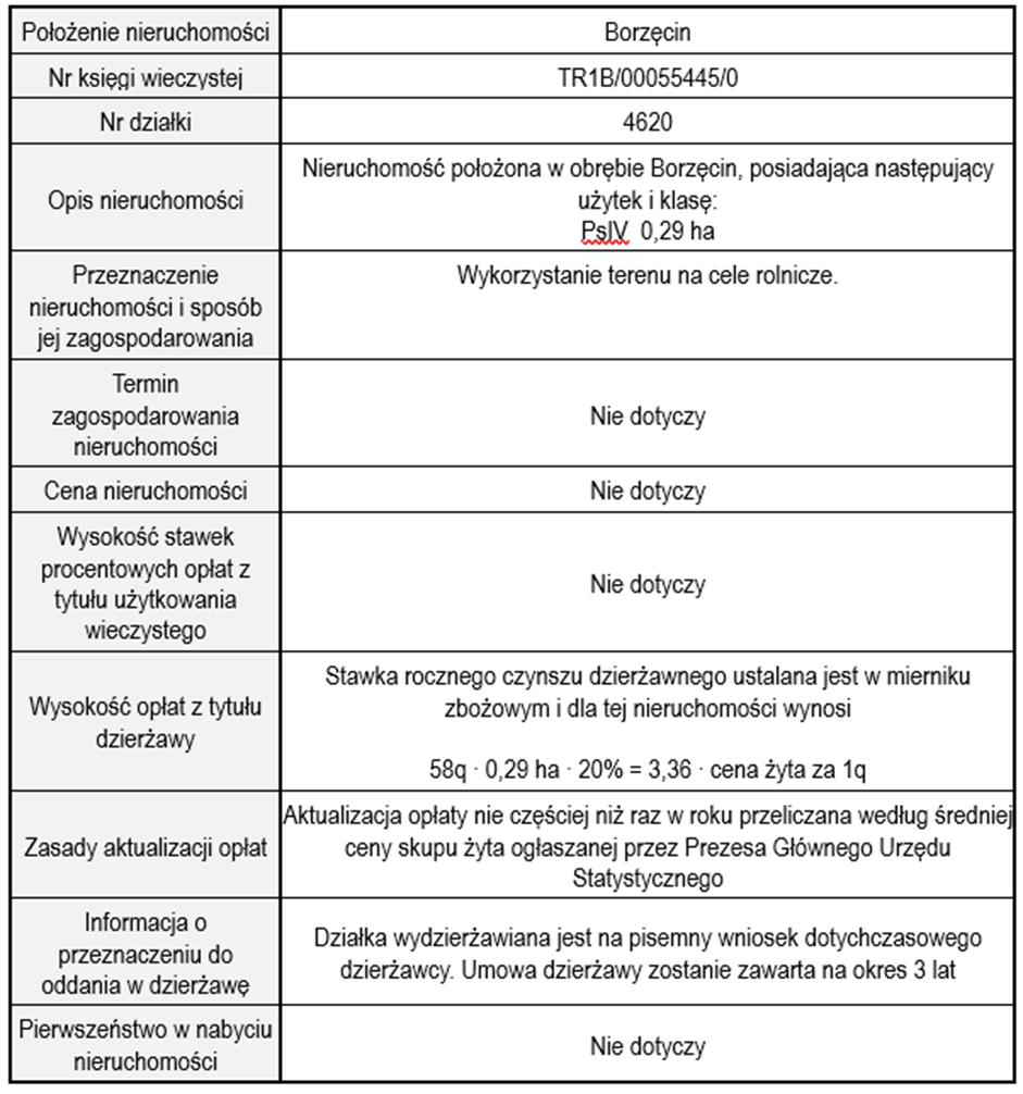 Przedmiotem dzierżawy jest nieruchomość gruntowa położona w obrębie Borzęcin, oznaczona w ewidencji gruntów jako działka nr 4620 o powierzchni 0,29 ha, dla której prowadzona jest księga wieczysta nr TR1B/00055445/0.