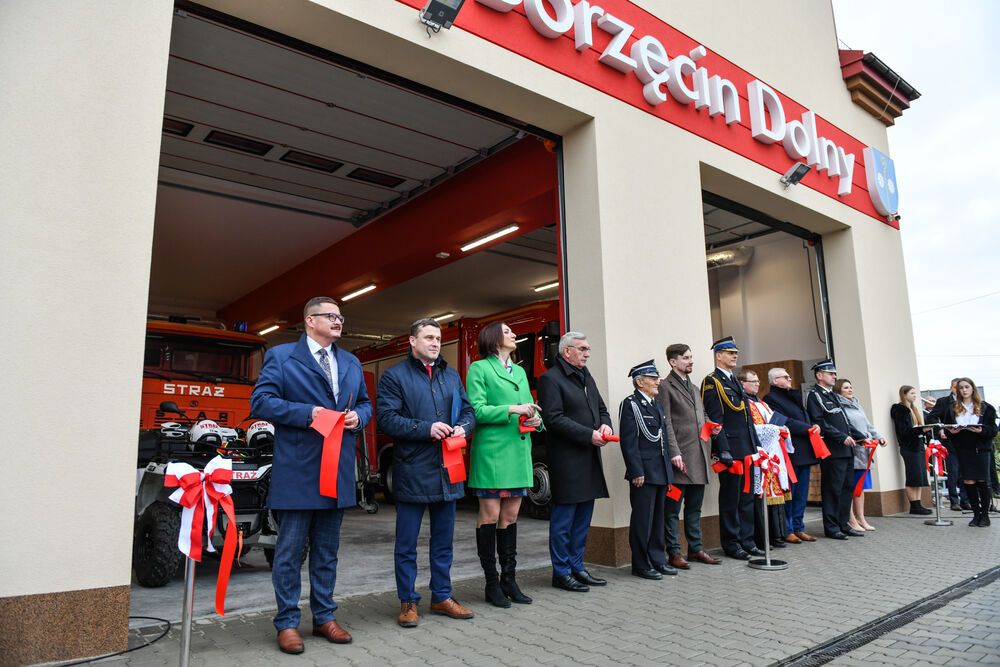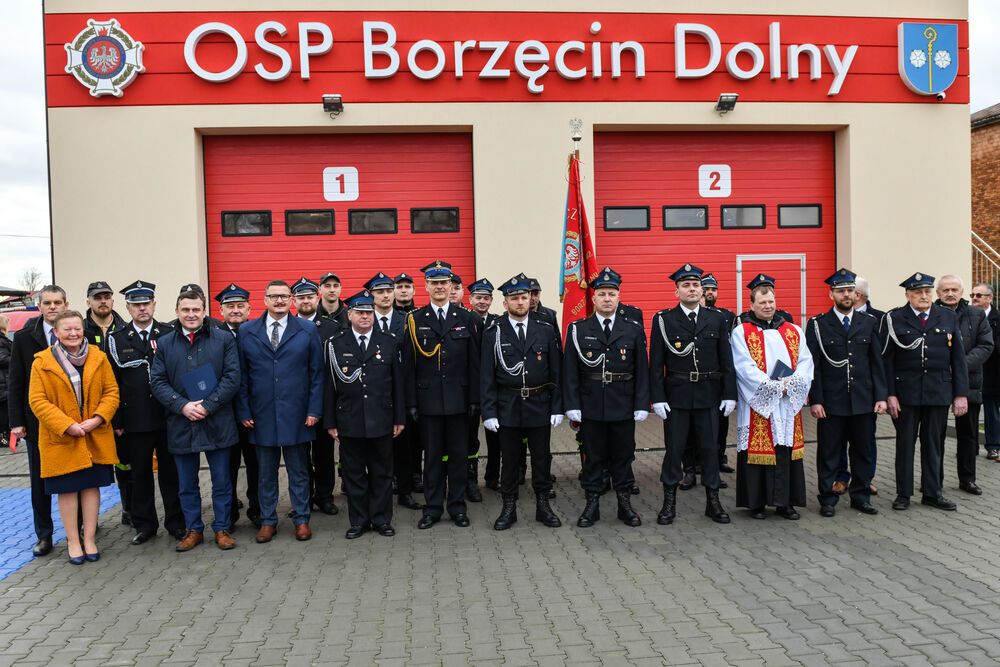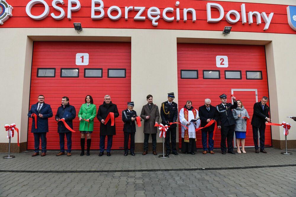 Kulminacyjnym punktem tej części wydarzenia było uroczyste przecięcie wstęgi i otwarcie budynku. Dokonali tego: Janusz Kwaśniak - wójt gminy Borzęcin, Wojciech Skruch - wiceprzewodniczący Sejmiku Województwa Małopolskiego reprezentujący podczas uroczystości również marszałka województwa małopolskiego Witolda Kozłowskiego, Marta Malec-Lech - członek zarządu Województwa Małopolskiego, Piotr Łosiński - przedstawiciel Władysława Kosiniaka-Kamysza, Wicepremiera i Ministra Obrony, Andrzej Potępa – starosta powiatu brzeskiego, Marian Zalewski - prezes zarządu Oddziału Powiatowego ZOSP RP w Brzesku, starszy brygadier Janusz Potera - komendant powiatowy PSP w Brzesku, ks. prałat Marek Obrzut - proboszcz Parafii w Borzęcinie Dolnym, Czesław Małek - przewodniczący Rady Gminy Borzęcin, druh Grzegorz Małek - prezes OSP w Borzęcinie Dolnym, Sylwia Hebda - prezes Stowarzyszenia Gospodyń Wiejskich i Gospodarzy „Zdolniacy” z Borzęcina Dolnego oraz Piotr Kania - dyrektor Gminnego Ośrodka Kultury w Borzęcinie. Po przecięciu wstęgi obiekt został poświęcony przez proboszcza Marka Obrzuta oraz powiatowego kapelana strażaków ks. Grzegorza Srokę. Pierwszą odsłonę uroczystości zakończył meldunek strażacki oraz pamiątkowe zdjęcie wykonane przez wszystkich zebranych.