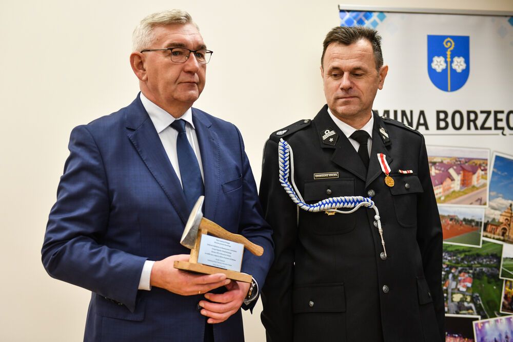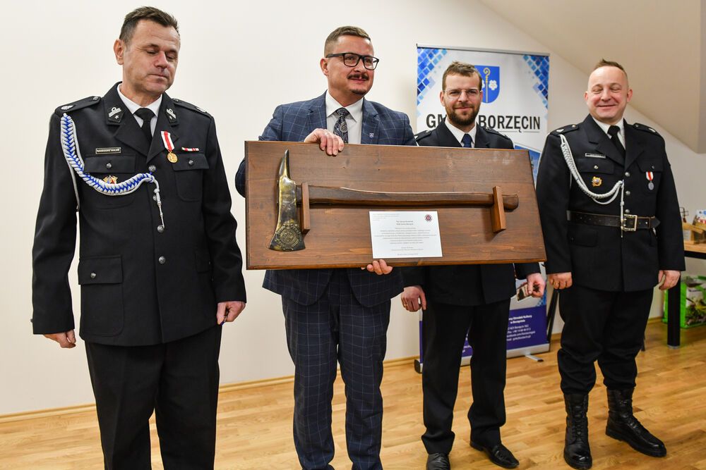 Podziękowania przekazali także strażacy. Naturalnie, pierwsze z nich skierowano w stronę wójta gminy, dziękując za konsekwencję w działaniu, zaangażowanie i pozyskane dofinansowanie. – Dziękuję Ci w imieniu druhów i własnym, bo zawsze spotkałem się z Twoją życzliwością na każdym kroku realizacji tego zadania. Śmiem twierdzić, że żadna jednostka w gminie Borzęcin, w powiecie i województwie nie ma tak wspaniałego obiektu – mówił prezes Małek wręczając wspólnie z druhami okazały topór strażacki z okolicznościowym grawerem.