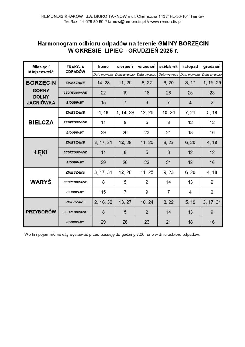 Do pobrania: Harmonogram odbioru odpadów na terenie GMINY BORZĘCIN W OKRESIE LIPIEC - GRUDZIEŃ 2025 r.